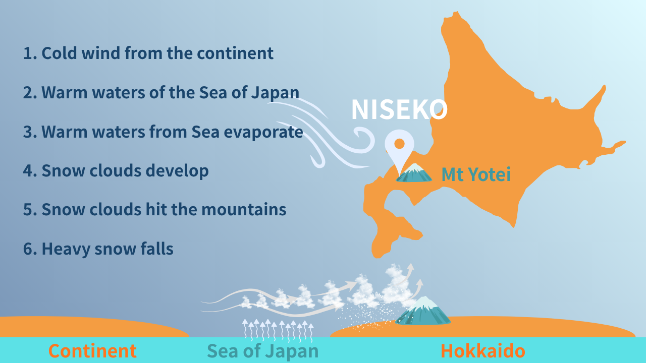 Hokkaido is unique because geography and climate reinforce each other. The warm current off the Sea of Japan supplies moisture; cold Siberian air provides the freezing temperatures needed to create dry crystals; mountains lift the moist air and trigger heavy snowfall. The repeated cycle of moisture pickup and orographic deposition is what makes certain Hokkaido ranges so consistently powdery.